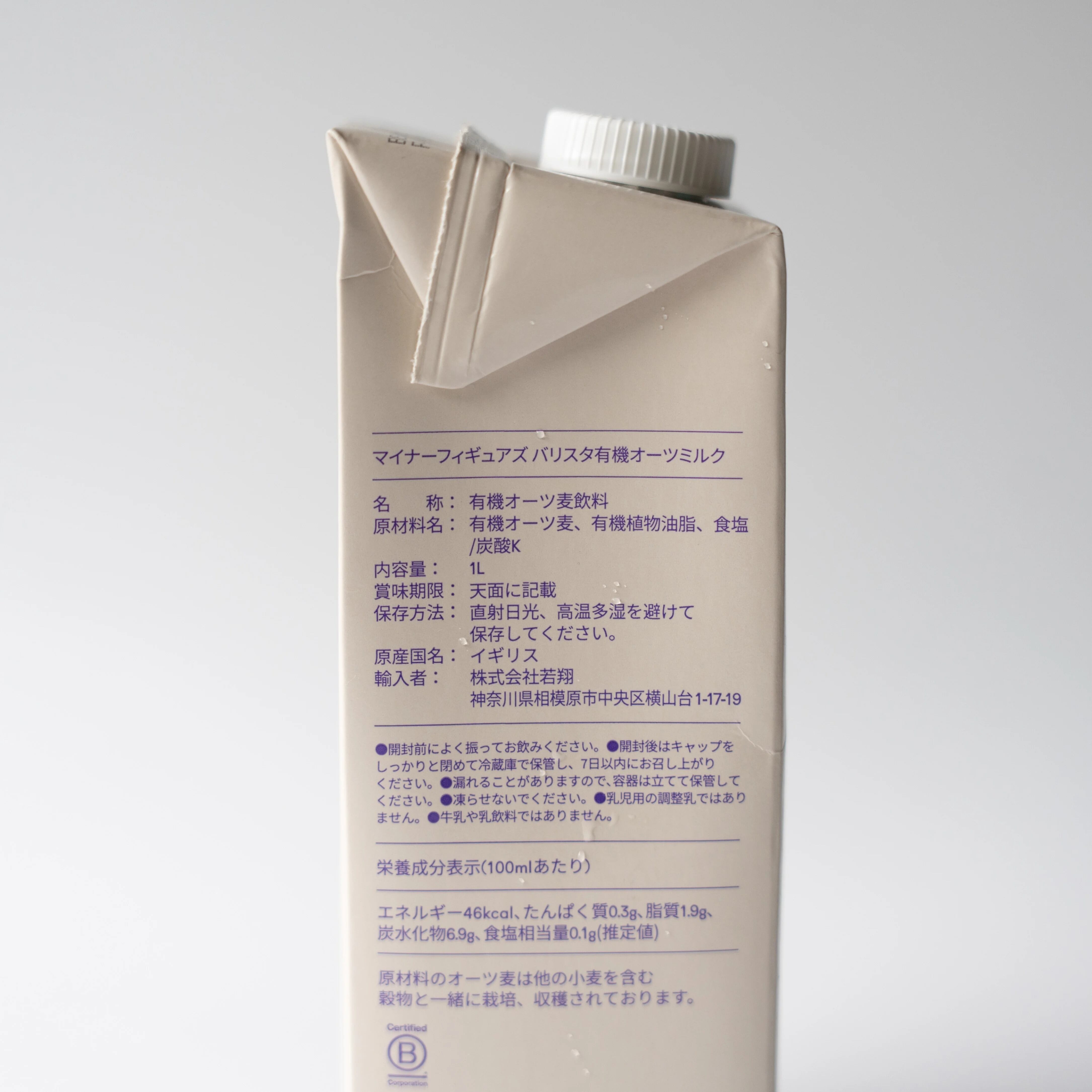 植物性のミルクの中でも有機オーツ麦で作られたミ ルクのことです。食物繊維が豊富で低GIで、糖質が少 なく、クセもなく、オーツ麦の香ばしいコクと風味、 穀物のすっきりとした甘みが特徴で、コーヒーの組み 合わせは抜群です!
