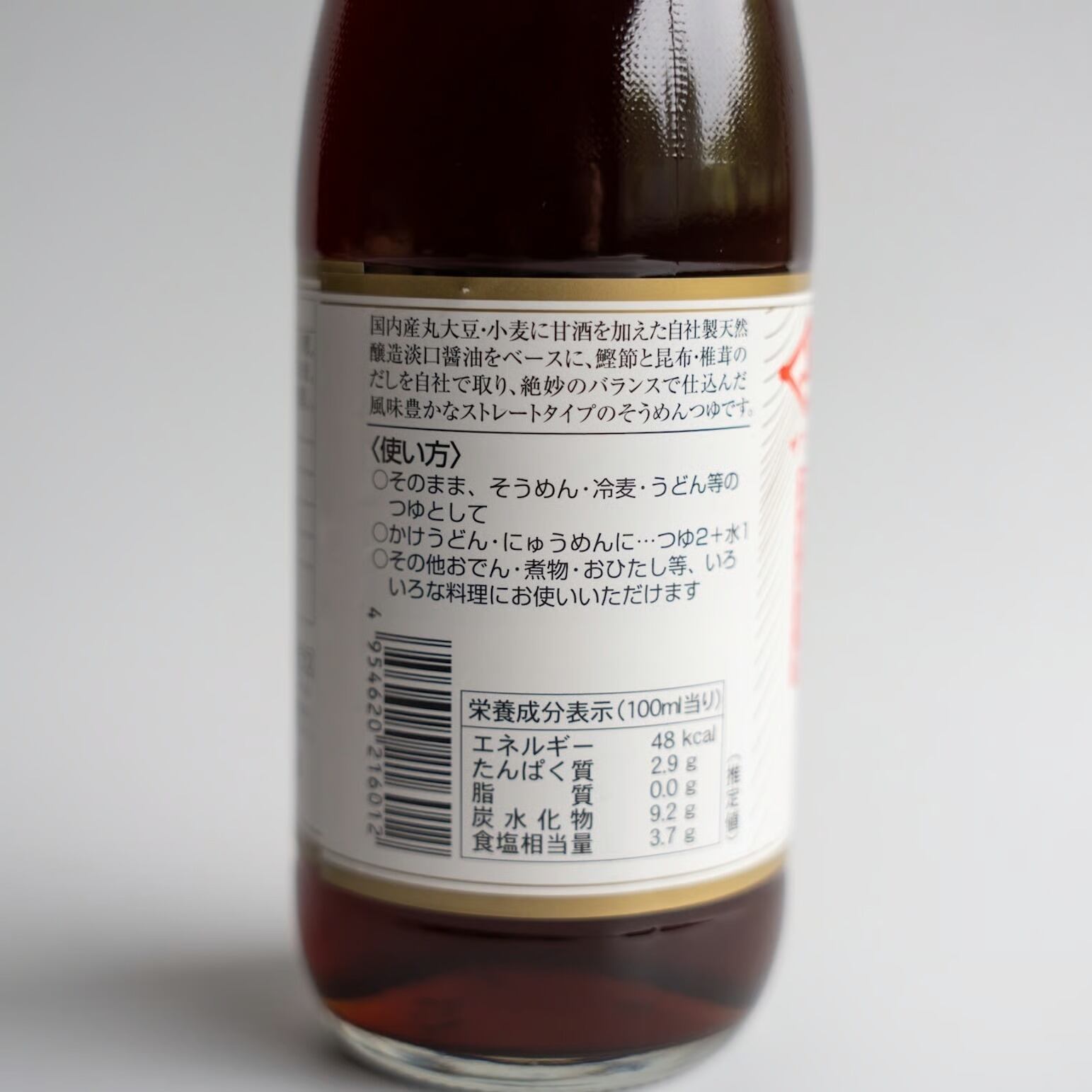 甘酒入り淡口醤油をベースに、自社で鰹節、椎茸、昆布からだしを取り、上品な味に仕上がっています。(ストレートタイプ)