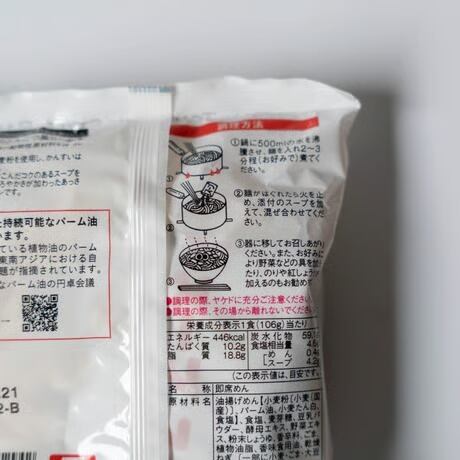 【原材料】油揚げめん〔小麦粉(小麦〈国産〉)、パーム油、小麦たん白、食塩〕、食塩、麦芽糖、 豆乳パウダー、酵母エキスパウダー、野菜エキスパウダー、粉末しょうゆ、 香辛料、ごま、植物油脂、香味食用油、乾燥ねぎ、 (一部に小麦・ごま・大豆を含む)