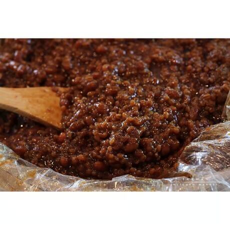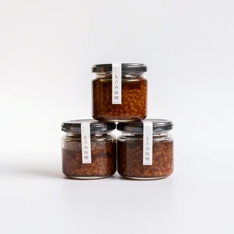 国産大麦、大豆、米、小麦と素材にこだわった原料を使用し、麹を一から作り、48時間かけて麹を作り、約1年半じっくりねかせた搾りたての濃口生醤油を加え、発酵熟成させた甘みのある生もろみ味噌です。